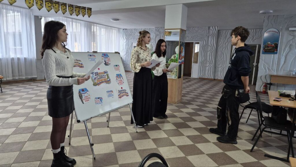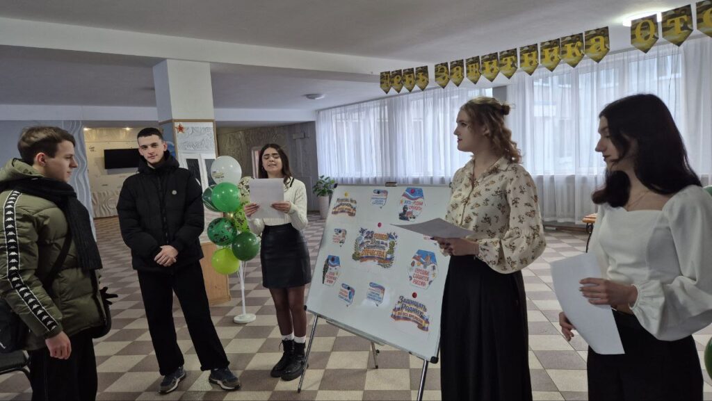 Студенты окунулись в атмосферу праздника и продемонстрировали свои знания в области военной тематики. Участникам предлагалось продемонстрировать свою эрудицию, отгадав названия известных армейских и патриотических песен по предложенным картинкам-ассоциациям.