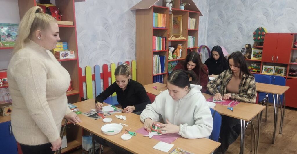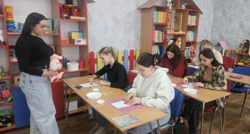 Целью занятия стало не только закрепление теоретических знаний, но и отработка практических навыков проектирования и проведения продуктивной деятельности с детьми дошкольного возраста. Студенты подготовили и реализовали занятия по аппликации, ориентированные на воспитанников младшей и средней возрастных групп.