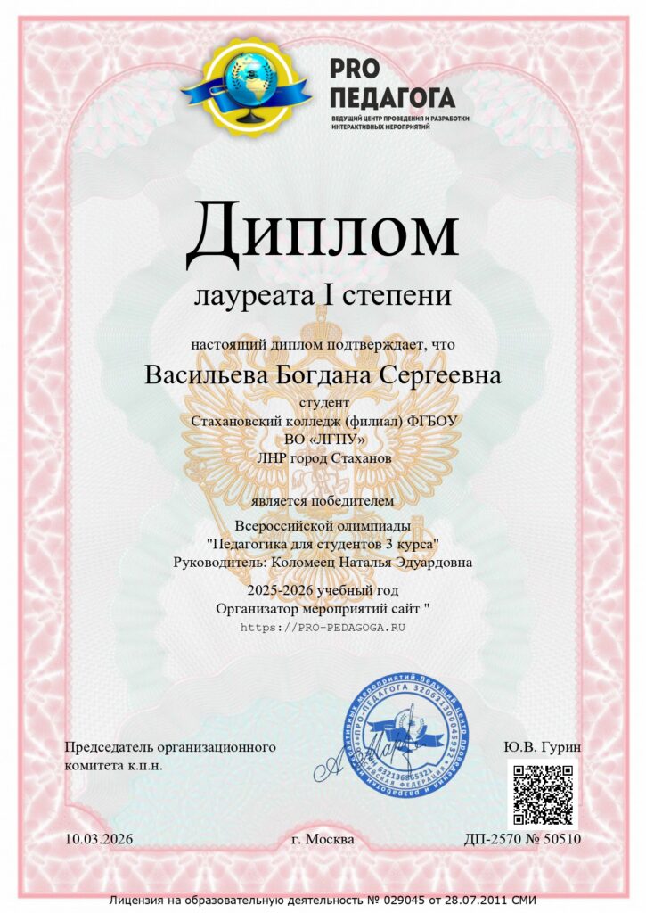 Студентка Стахановского колледжа ЛГПУ Богдана Васильева стала победителем Всероссийской олимпиады «Педагогика для студентов 3 курса».