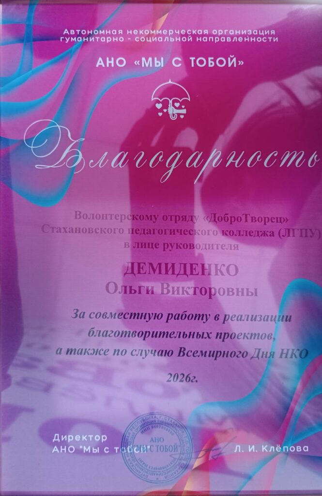 В преддверии Всемирного дня некоммерческих организаций волонтерский отряд «ДоброТворец» Стахановского колледжа ЛГПУ получил высокую оценку своей деятельности. Руководитель отряда Ольга Демиденко была удостоена благодарности от автономной некоммерческой организации гуманитарно-социальной направленности АНО «Мы с тобой».
