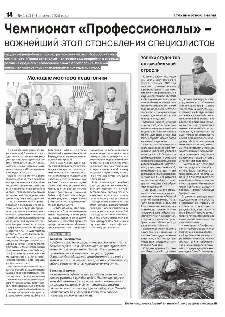 В газете «Стахановское знамя» (№ 1 от 01.04.2026) опубликован материал, посвященный итогам регионального этапа чемпионата «Профессионалы» на базе Стахановского колледжа ЛГПУ.