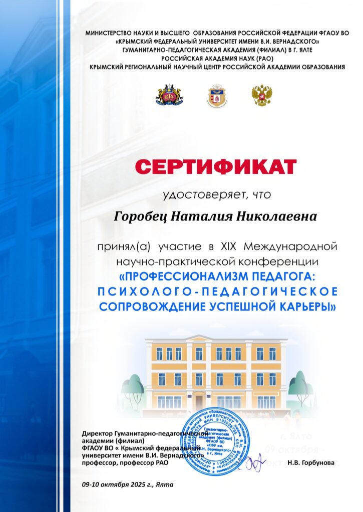 На базе Гуманитарно-педагогической академии «Крымский федеральный университет им. В.И. Вернадского» состоялась Международная научно-практическая конференция «Профессионализм педагога: психолого-педагогическое сопровождение успешной карьеры». В данном мероприятии приняла участие Наталия Горобец, кандидат педагогических наук, доцент, преподаватель психолого-педагогических дисциплин Стахановского колледжа #ЛГПУ.