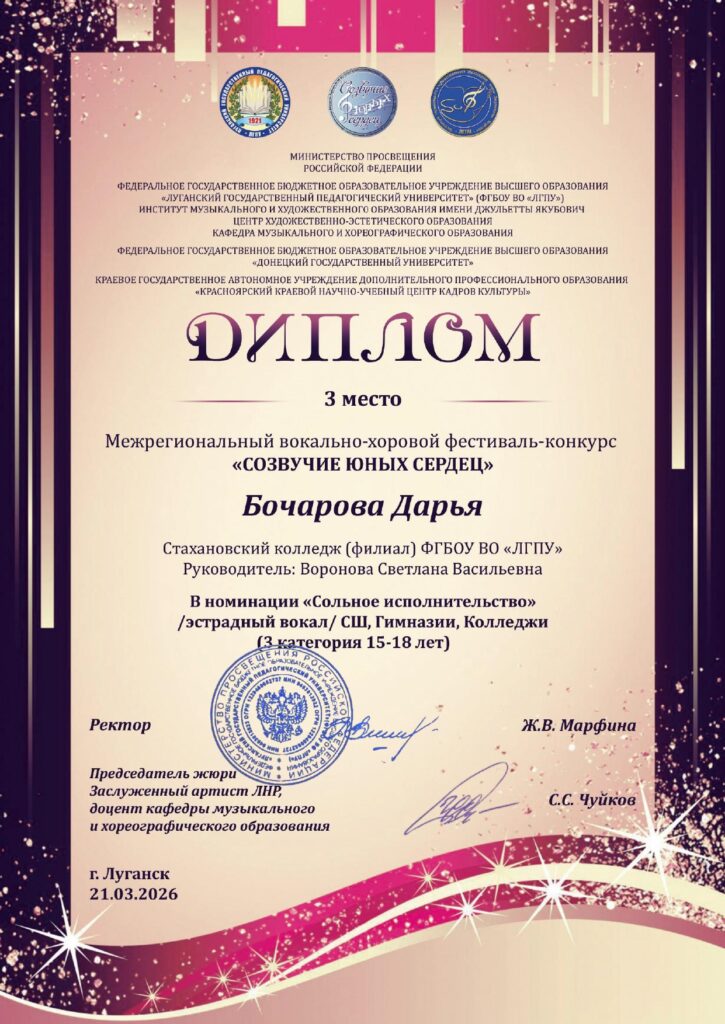 Институт музыкального и художественного образования имени Джульетты Якубович Луганского государственного педагогического университета подвел итоги Межрегионального вокально-хорового фестиваля-конкурса «Созвучие юных сердец». В конкурсе приняли участие конкурсанты из всех уголков Луганской Народной Республики, а также представители других регионов Российской Федерации.