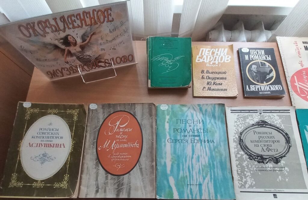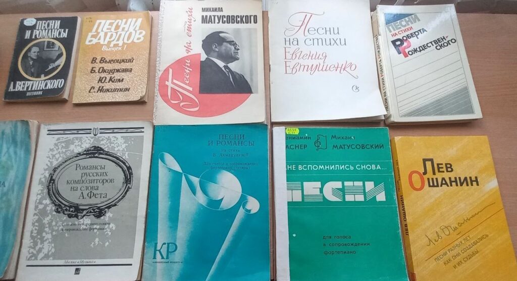 Также на выставке представлены сборники авторских песен В.Высоцкого, Б.Окуджавы, Ю.Кима, С.Никитина и др.