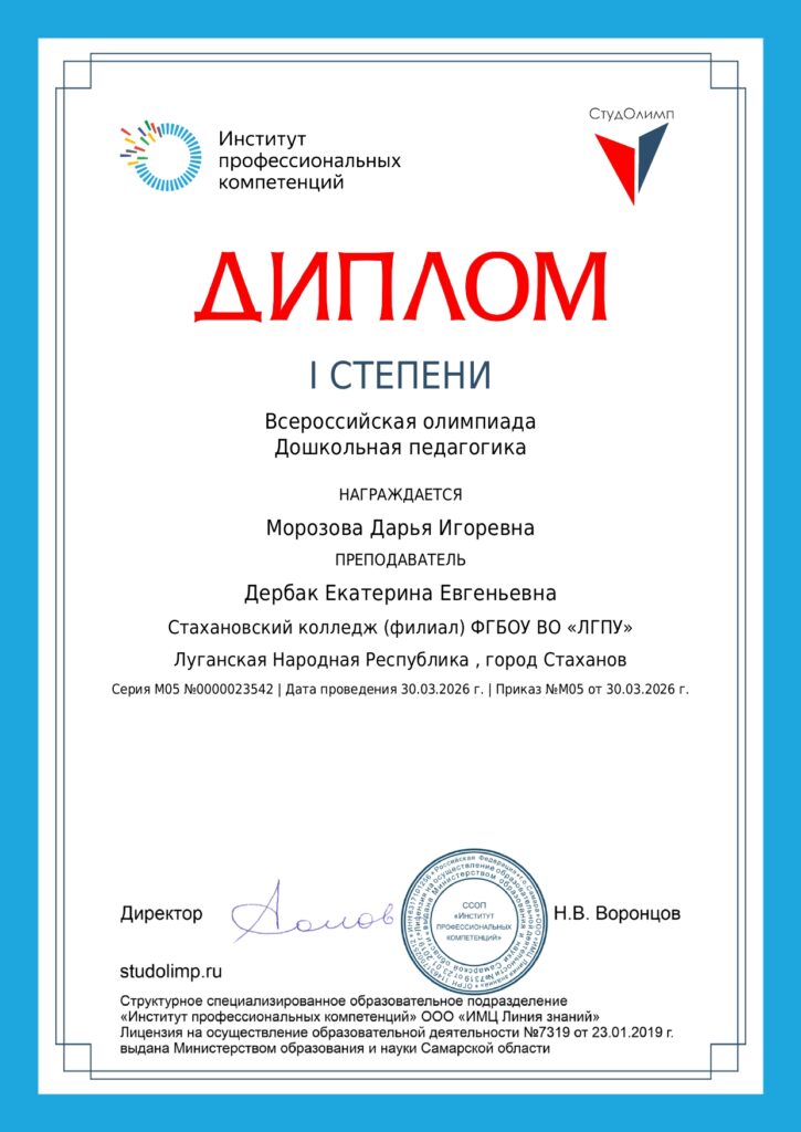 Дарья Морозова, обучающаяся в Стахановском колледже ЛГПУ, стала победительницей Всероссийской олимпиады по направлению «Дошкольная педагогика», получив высшую награду.